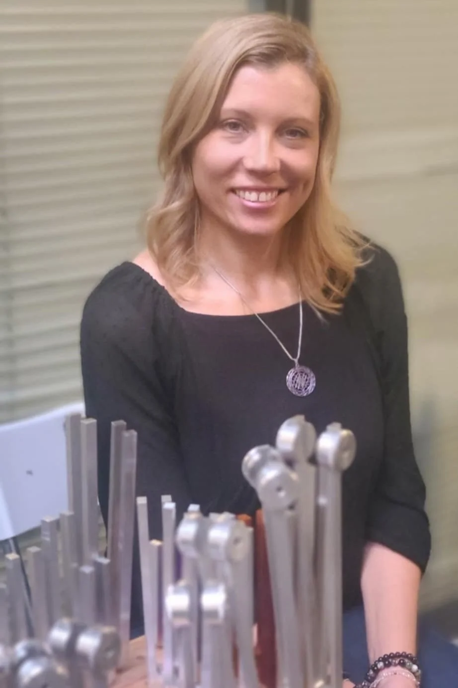 Nicole Jakubiak, Owner Radiant Life Holistic Wellness Center, Licensed Massage Therapist, Holy Fire Usui Karuna Reiki Master Teacher, playing crystal quartz bowls and Tibetan metal bowls in a group sound bath session.